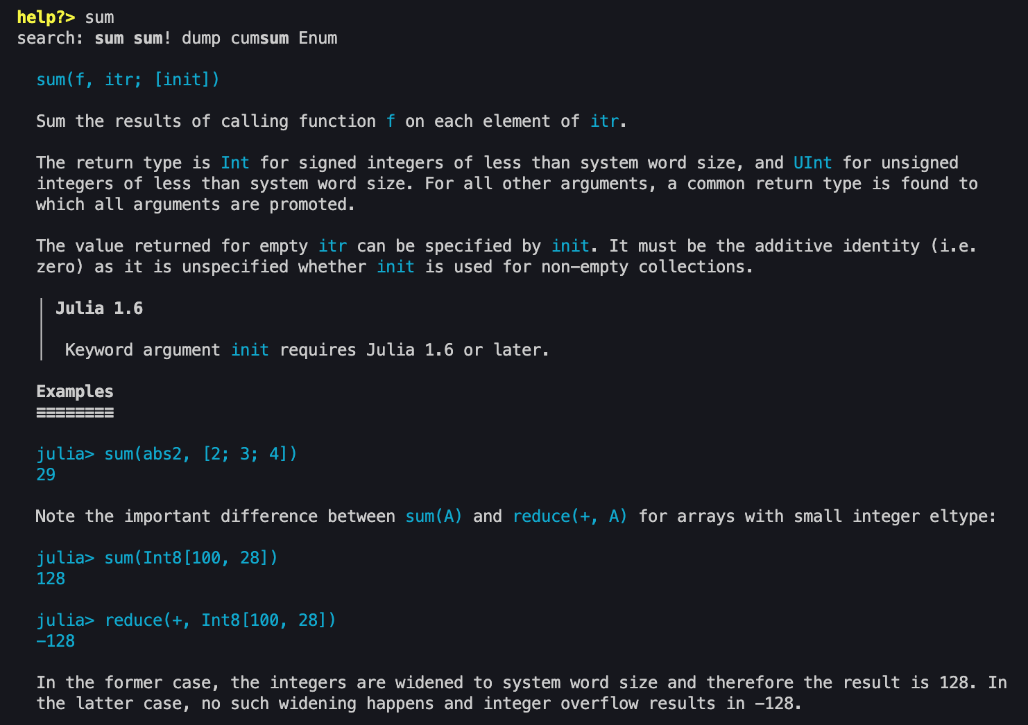 In help, you can use any function or type to search for its documentation. For example, we can see documentation of the function sum
