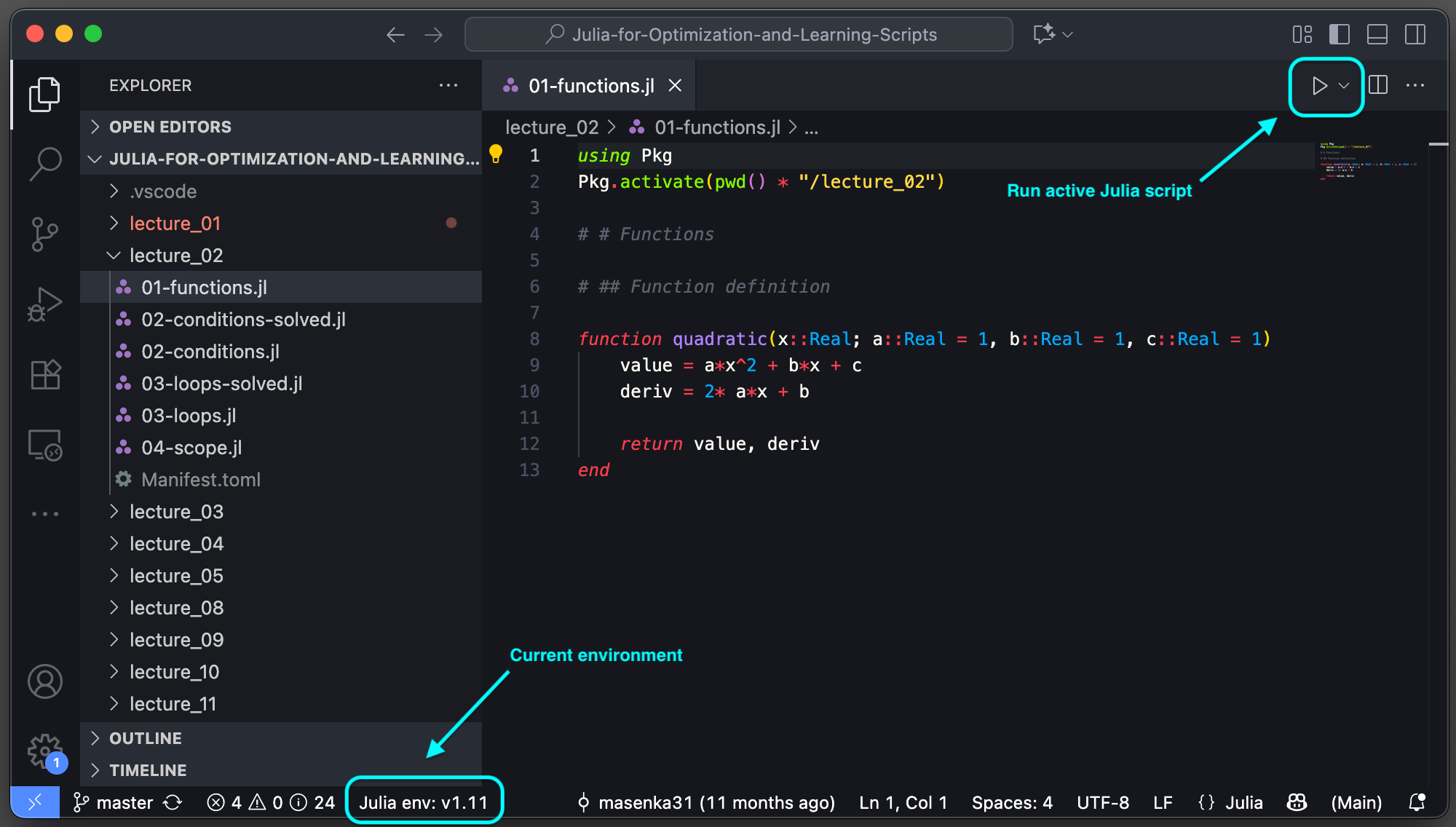 In the labs, we will be using Visual Studio Code to work on Julia projects and run Julia. An IDE like VS Code allows us to use certain keyboard shortcuts and other utilities (such as syntax highlighting) to more effectively work with Julia code.