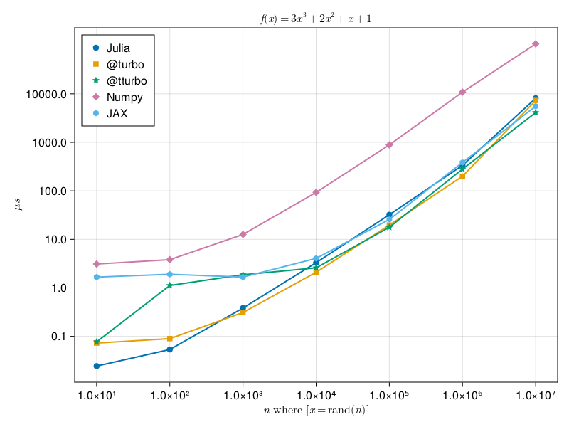 Let's for fun measure a difference in computation of a simple polynomial over elements of arrays between numpy, jax, default Julia, and Julia with LoopVectorization library.