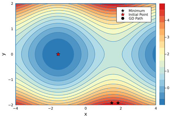 dfdy = f(Dual(x,zero(x)), Dual(y,one(y)))Reverse-mode AD can compute gradients of functions with many inputs and one output in one go. This is great because very often we want to optimize loss functions which are exactly that: Functions with many input variables and one loss output.