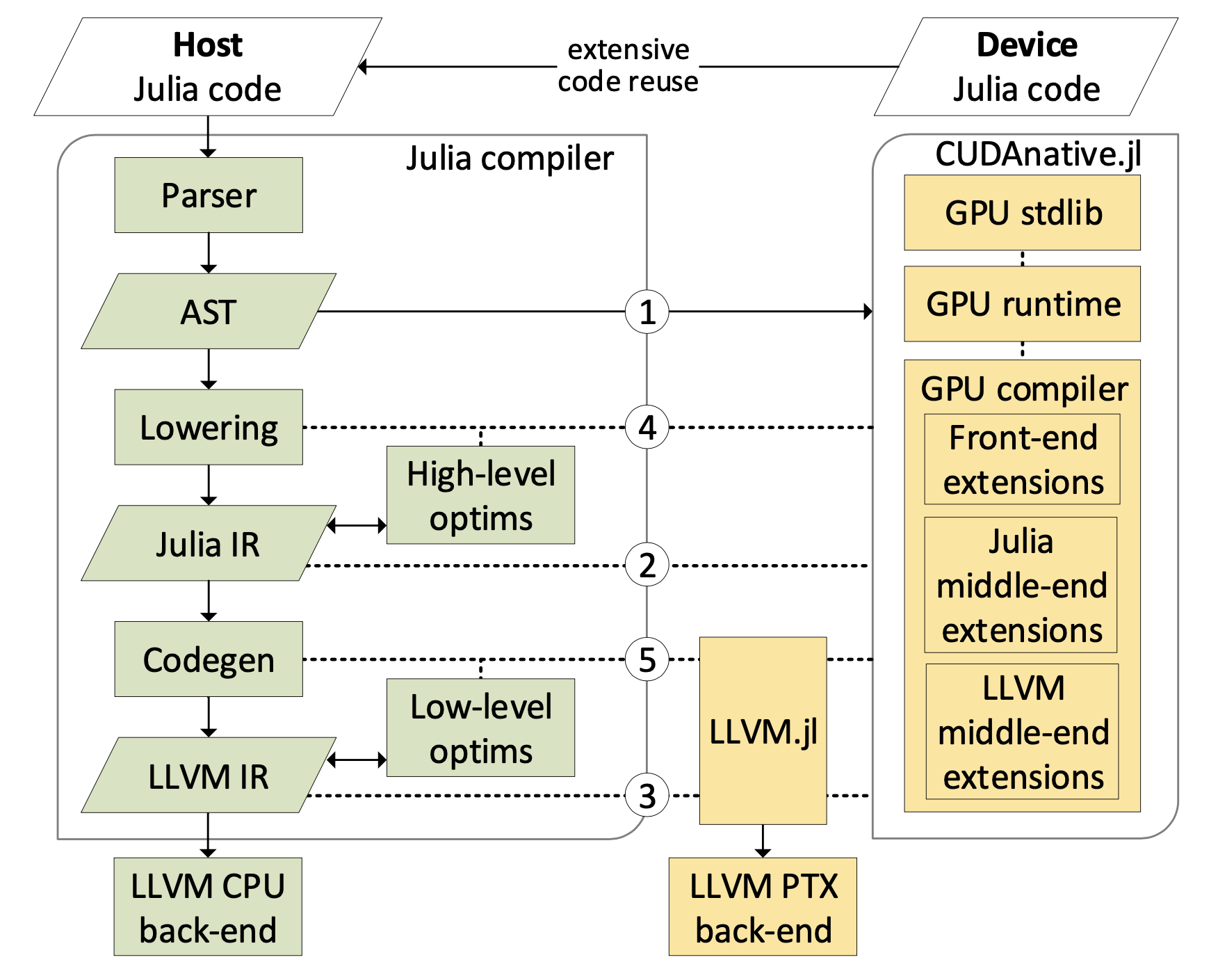 @code_llvm. This is the front-end part and its result is LLVM code in textual form (Julia's interface with its runtime part is textual).Take the LLVM code, perform optimization passes and adjustments, and compile the code of the kernel for CUDA backend. This is the back-end part.