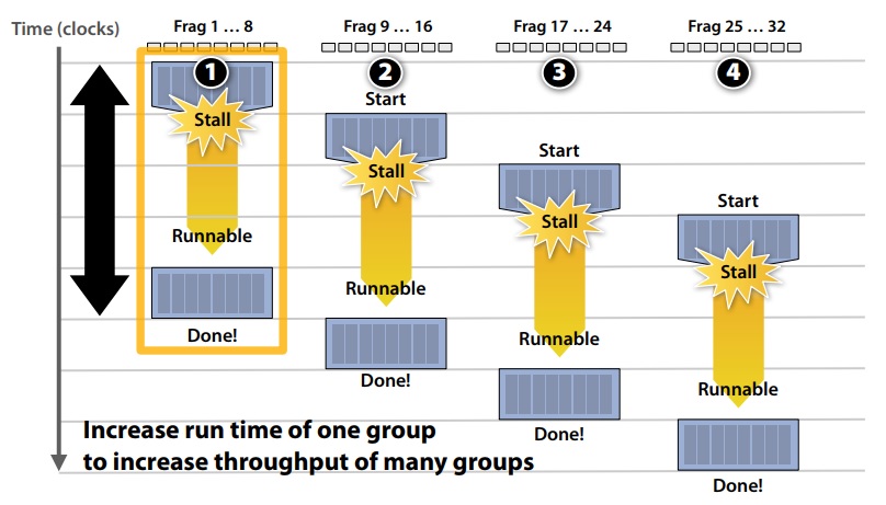 On the other hand large number of threads per group might stall due to insufficient number of registers and / or other threads being busy.