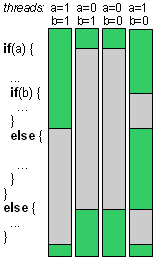 As has been mentioned above, all CUDA cores in one SM are processing the same instruction. therefore if the processed kernel contains conditional statements if / else blocks, both blocks will be processed in sequential order as illustrated below,